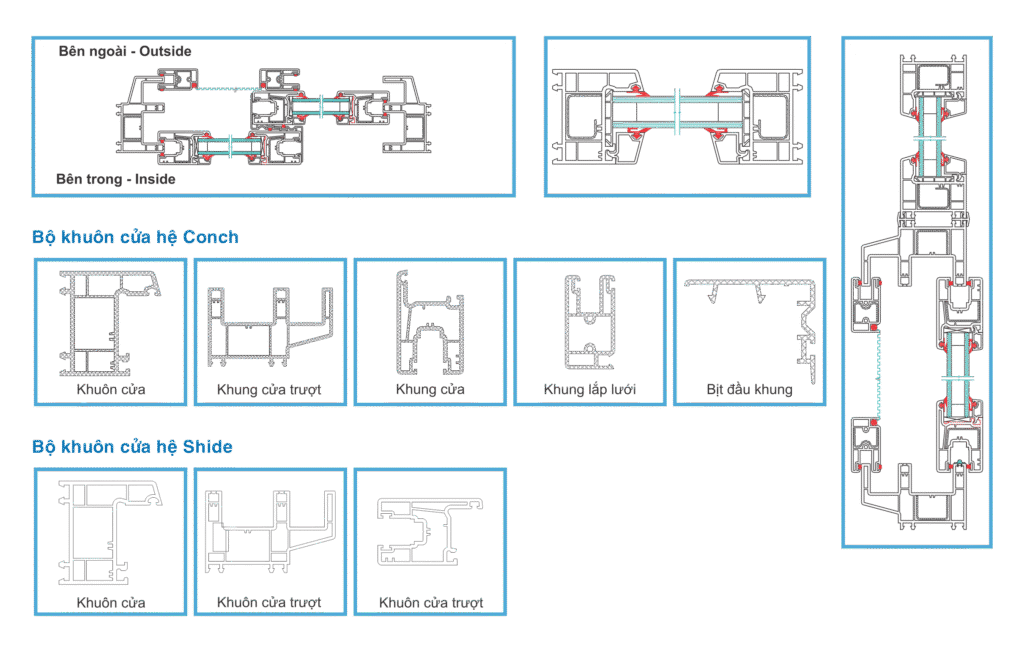 • Thanh khóa đa điểm, bản lề ma sát, trục lăn.