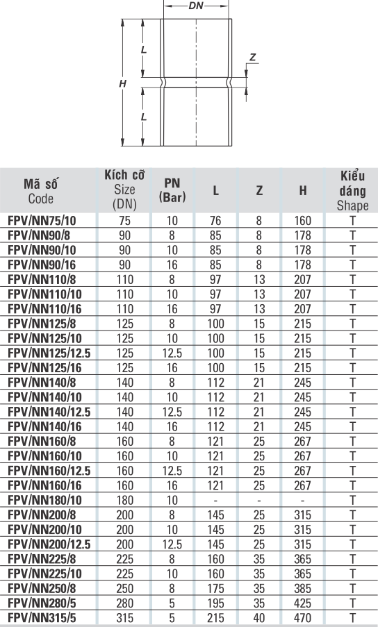 | Mã SP | FPV/NN75/10, FPV/NN90/8, FPV/NN90/10, FPV/NN90/16, FPV/NN110/8, FPV/NN110/10, FPV/NN110/16, FPV/NN125/8, FPV/NN125/10, FPV/NN125/12.5, FPV/NN125/16, FPV/NN140/8, FPV/NN140/10, FPV/NN14012.5, FPV/NN140/16, FPV/NN160/8, FPV/NN160/10, FPV/NN160/12.5, FPV/NN160/16, FPV/NN180/10, FPV/NN200/8, FPV/NN200/10, FPV/NN200/12.5, FPV/NN225/8, FPV/NN225/10, FPV/NN250/8, FPV/NN280/5, FPV/NN315/5 |